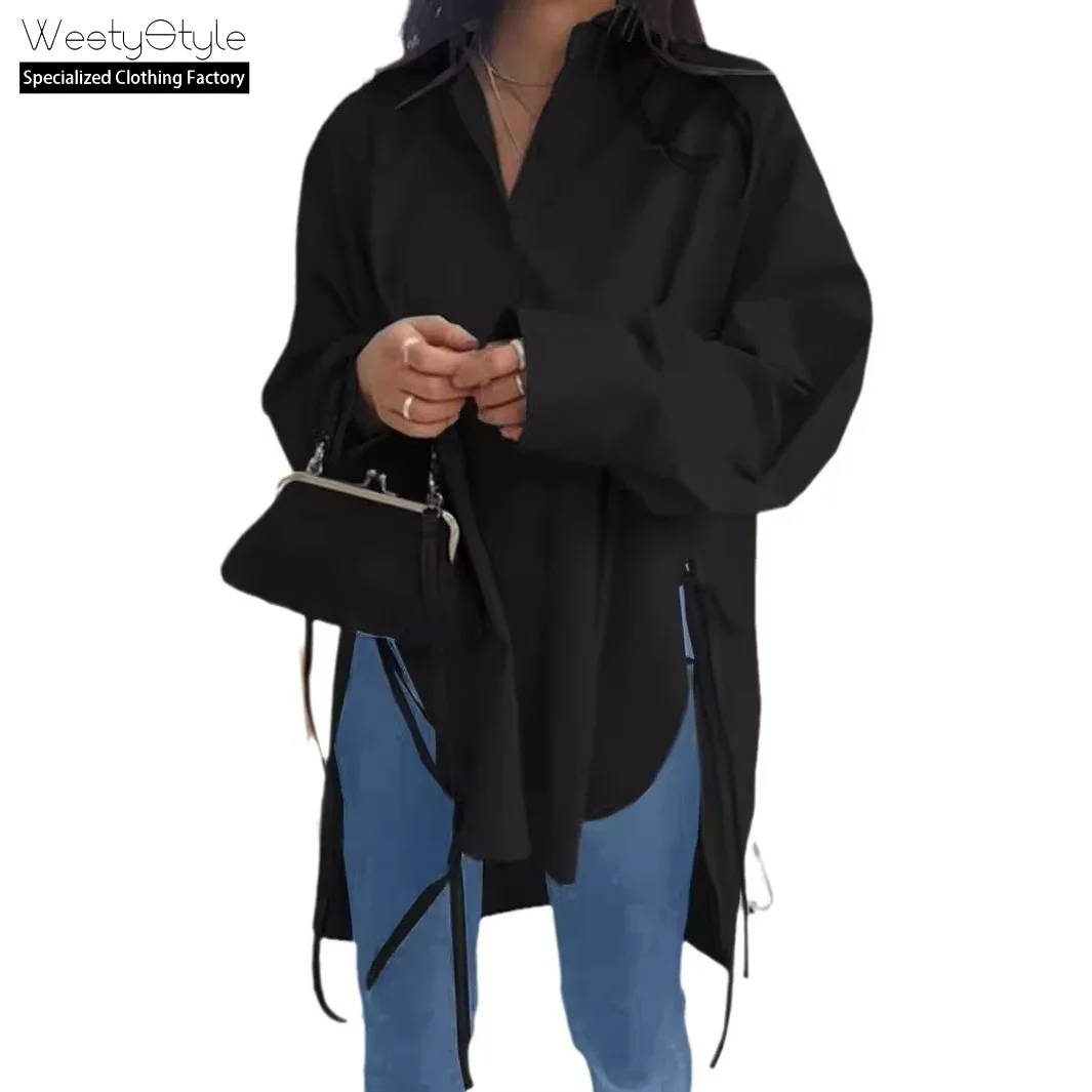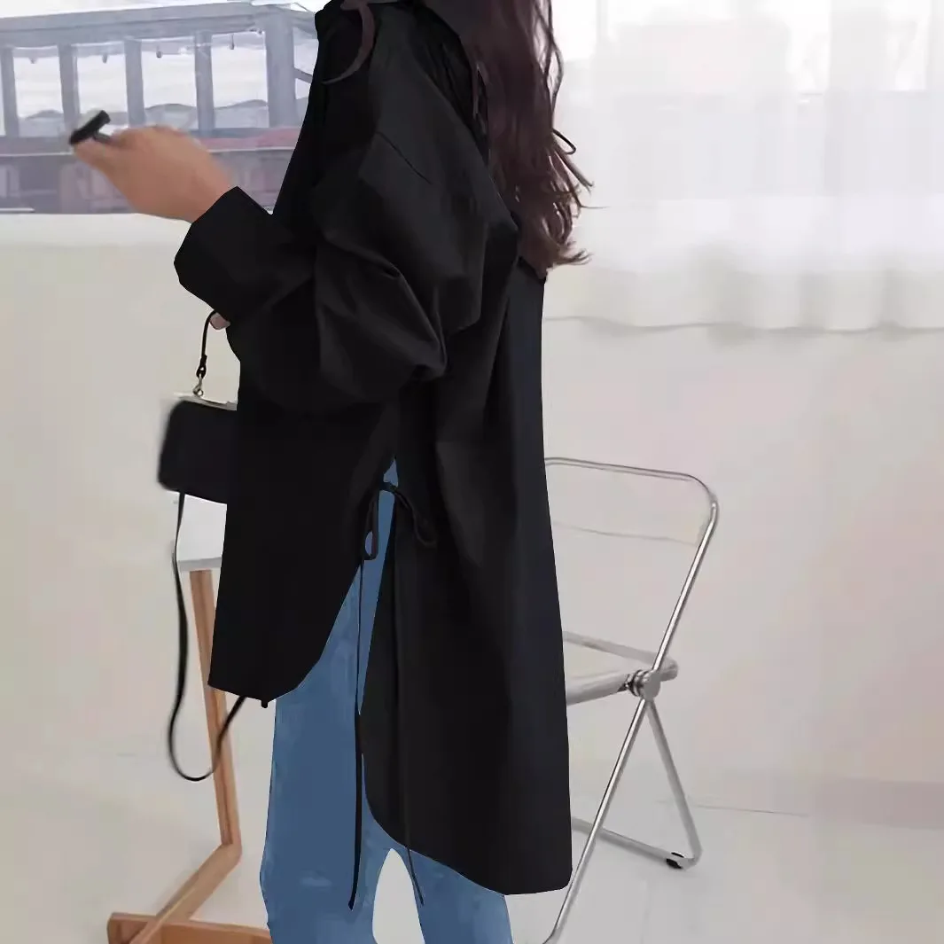 Early Autumn Women's Slimming Long Tie Shirt European American Solid Casual Loose Front Short Back for Office Wear